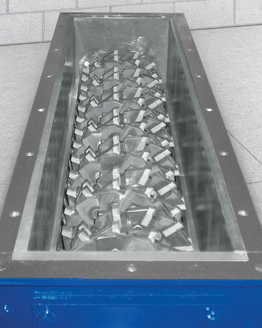 Each cutter at the Opelousas plant has a 30 in. (76 cm) long by 11 in. (28 cm) wide infeed chute. The cutters are made of stainless steel, which resists abrasion, corrosion and other problems that CaCl2 presents. Cal-Chlor operates the machines at between 1,200 to 1,800 RPM to achieve the desired particle size.