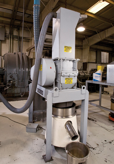 Click to enlargeEdge trim from a calendering line is fed pneumatically into a tube atop the rotor enclosure of the Screen Classifying Cutter for downsizing.