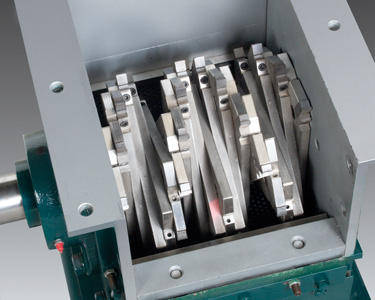 Standard models have an 11 in. (28 cm) wide infeed throat that houses a 10.5 in. (26.7 cm) diameter horizontal rotor comprised of tightly-packed, staggered parallelograms, each of which holds two, half-inch wide (1.3 cm wide) cutter tips. An ultra-heavy duty Magnum™ version with 22.5 in. (57 cm) wide infeed throat has an 18 in. (46 cm) diameter rotor comprised of 4-sided “stars,” each of which holds four one-inch wide (1.3 cm wide) cutter tips, boosting capacity by approximately 75 percent and accommodating larger infeed sizes.