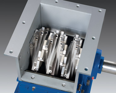 The infeed throat houses a horizontal rotor comprised of tightly-packed, staggered parallelograms or “stars,” each of which holds cutter tips that shear materials against twin stationary bed knives at lower rotor speeds, and additionally impart high impact at higher RPM. The rotor design generates many times greater force per inch with each cut than a conventional knife-type cutter of equivalent horsepower.