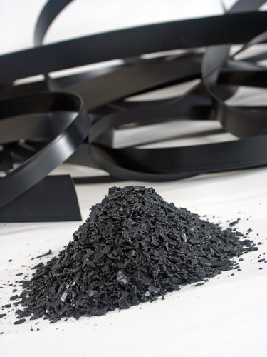 Scrap from the extruders and a calendaring line ranges in thickness from 0.008 to 0.04 in (8 to 40 mils). The scrap is pneumatically fed to the cutters in a continuous operation that runs 24/7. Each cutter processes at a rate of 250 lb/h (113 kg/h).