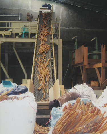 Click to enlargeAs bags of raw cinnamon quills arrive at the plant, they are emptied onto a belt conveyor for processing.