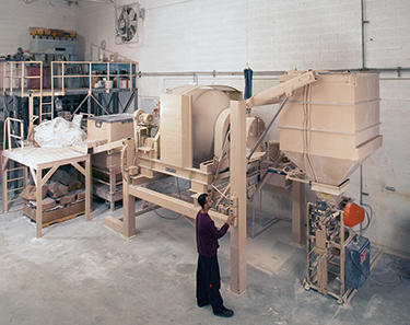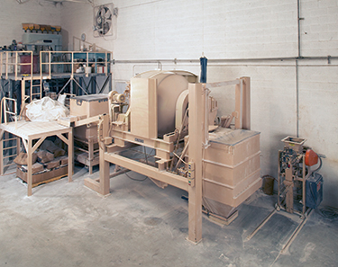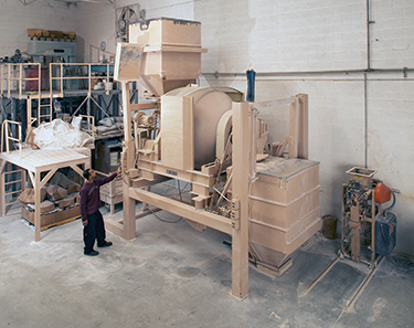 The discharge hopper, containing a newly mixed batch, is now in the "up" position and placed over the packing machine, which fills 50-lb bags.