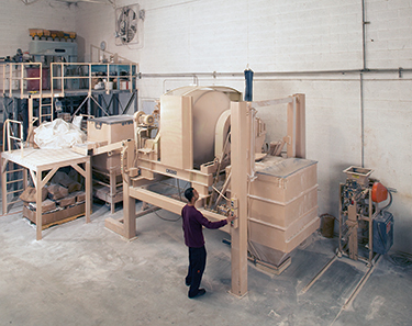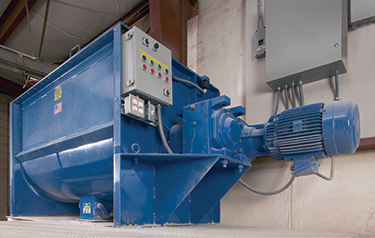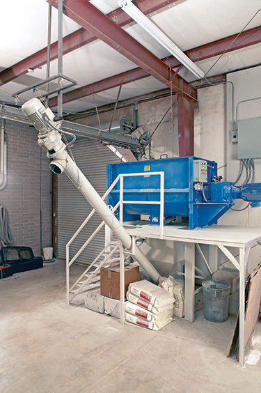 PVC and wood fibers for extruded products are mixed in this Munson paddle blender. PVC is loaded into the blender from the plant's main PVC feed line (the horizontal gray pipe located near the ceiling to the left of the blender). Mixed material is discharged from the bottom of the blender and loaded into a moveable hopper by an auger (the long, white pipe in the foreground).