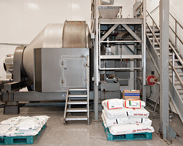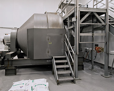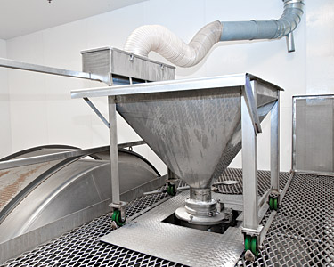 Click to enlargeBulk ingredients are fed into the mixer's intake chute through a hopper at mezzanine level as the mixing drum rotates, shortening cycle times.