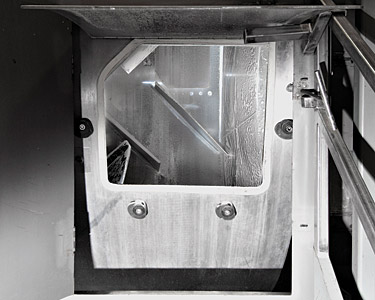 Click to enlargeThe sliding intake chute of the Rotary Batch Mixer allows rapid access to the drum interior for cleaning and inspection.