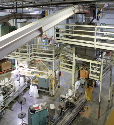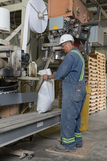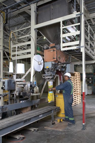 Operator fills 44 lb (20 kg) plastic fiber sacks at the bagging machine below the mixer and hopper