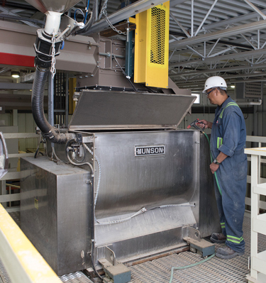 To blend dry ingredients with liquid additions in batches up to 660 lb (300 kg), the company installed a Munson model MF-18-SS fluidized bed mixer.