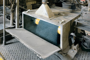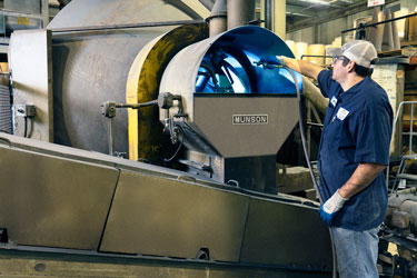 Click to enlargeContinuous rotation of the drum during discharge prevents stratification of ingredients having disparate sizes, shapes and bulk densities, and empties the batch in a steady stream.