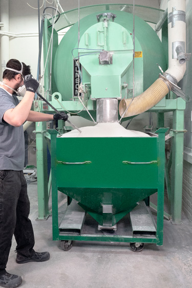 The mixer discharges uniformly blended product into a mobile bin, which is wheeled to low-pressure extruders and the hot-melt casting process. Dust is collected during discharge.