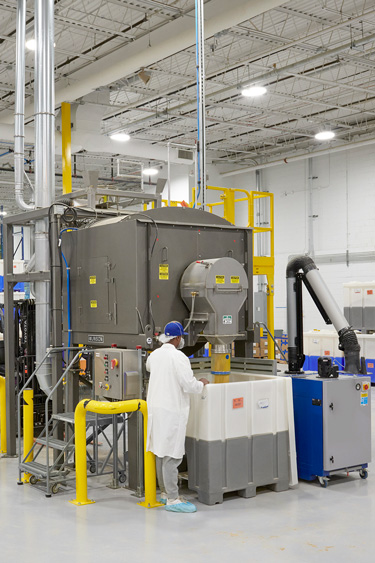 Operators weigh and empty ingredients into bowls which are emptied into a 20 cu ft (0.56 m3) hopper that feeds the Rotary Batch Mixer.