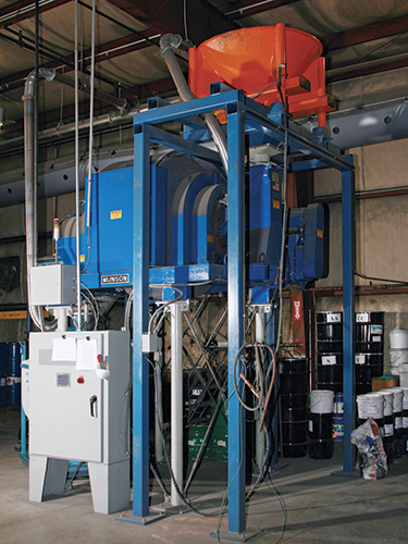 Raw powder ingredients are weighed in floor hoppers equipped with load cells, and moved pneumatically into surge hoppers positioned above each blender. When an operator initiates a blending cycle, a surge hopper valve opens to discharge accumulated batch ingredients into the rotating Munson blender.
