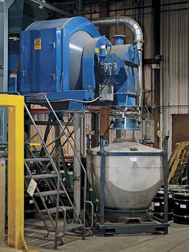 Baffles in the rotating mixing chamber continually lift and direct material toward the discharge spout that is equipped with a head assembly designed specifically for Mi-Tech. "While the powder will discharge from the blender on its own," says Stahl, "we needed a way of controlling how it is discharged into the intermediate bulk containers we use." Once filled with blended powder, the bulk containers are moved using tow motors.