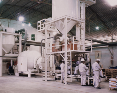 Click to enlargeThe 180 cu ft (51 cu m) capacity rotary mixer evenly impregnates microgranules with liquid chemicals to produce insecticides.