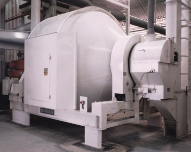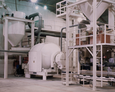 Click to enlargeThe hopper (at left) feeds clay or quartz into the 700-TSC-180 rotary mixer. Chemicals are sprayed as the batch rotates.